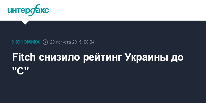 Москва. 28 августа. INTERFAX.RU - Международное рейтинговое агентство Fitch Ratings снизило рейтинг Украины по обязательствам в иностранной валюте до "С" с "СС" с учетом объявленного в четверг Киевом соглашения с кредиторами о реструктуризации еврооблигаций.