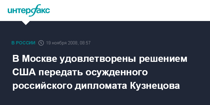 Москва. 19 ноября. INTERFAX.RU - В Москве удовлетворены решением США передать властям РФ российского дипломата Владимира Кузнецова, осужденного американским судом.