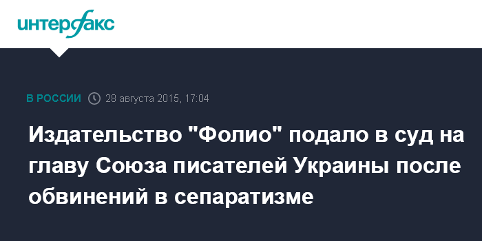 Москва. 28 августа. INTERFAX.RU - Украинское издательство "Фолио" подало исковое заявление в суд "в связи с распространением оскорбительной и недостоверной информации" председателем Национального союза писателей Украины Михаилом Сидоржевским.