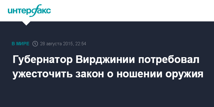 Москва. 28 августа. INTERFAX.RU - Глава административной власти американского штата Вирджиния Терри Маколифф в пятницу заявил о необходимости ужесточить законы об использовании огнестрельного оружия после убийства двух тележурналистов.