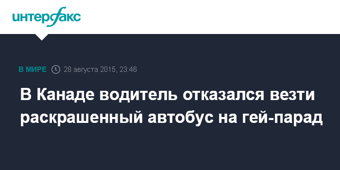 Москва. 28 августа. INTERFAX.RU - В Канаде водитель автопарка Calgary Transit заявил, что бросит работу, если руководство заставит его везти автобус на Calgary Pride Festival, раскрашенный в соответствующие цвета. Об этом пишет канадская National Post.