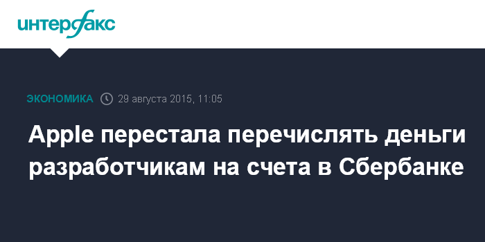 Москва. 29 августа. INTERFAX.RU - Apple отказалась перечислять выплаты российским разработчикам приложений для операционных систем OS X и iOS на счета в Сбербанке. Об этом пишет сегодня газета "Ведомости". Информацию изданию подтвердили несколько разработчиков, заявив, что уже заметили недопоступление денег.