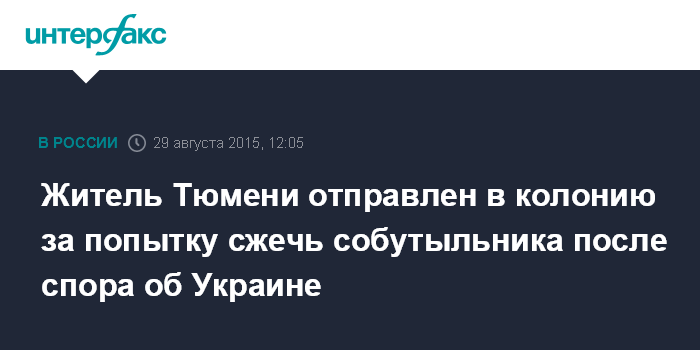 Москва. 29 августа. INTERFAX.RU - Суд в Тюмени приговорил к шести годам колонии строгого режима местного жителя, который пытался заживо сжечь своего собутыльника из-за разногласий по ситуации на Украине.