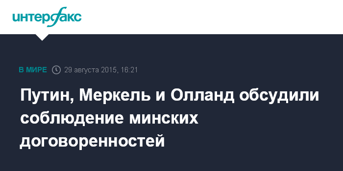 Москва. 29 августа. INTERFAX.RU - Канцлер ФРГ Ангела Меркель и президент Франции Франсуа Олланд в ходе телефонных переговоров с президентом России Владимиром Путиным подтвердили приверженность соблюдению минских соглашений, сообщило в субботу правительство Германии.