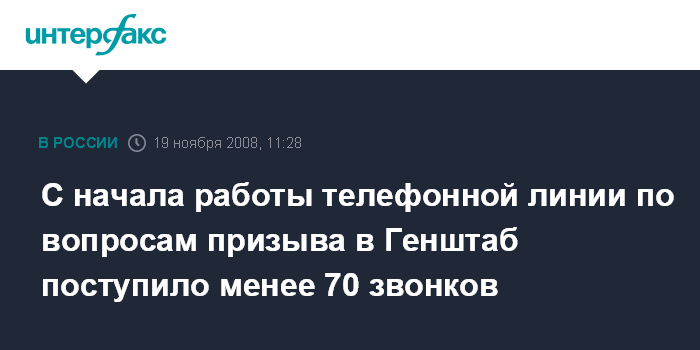 Москва. 19 ноября. INTERFAX.RU - Около 70 обращений поступило на горячую телефонную линию по вопросам осеннего призыва, открытую в Генеральном штабе ВС РФ, заявил журналистам в среду начальник направления призыва Главного организационно-мобилизационного управления Генштаба Евгений Бурдинский.