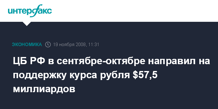 Москва. 19 ноября. INTERFAX.RU - Банк России в сентябре-октябре потратил на поддержку курса рубля $57,5 млрд, в результате переоценки валютные резервы уменьшились на $30,1 млрд, на депозиты в ВЭБе было размещено $14 млрд, сообщил председатель Банка России Сергей Игнатьев, выступая на пленарном заседании Госдумы в среду.
