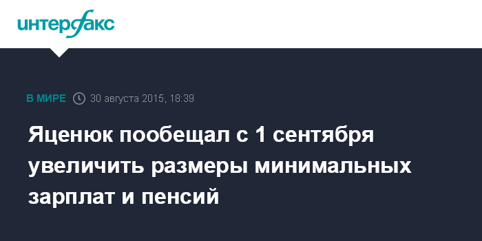 Москва. 30 августа. INTERFAX.RU - Премьер-министр Украины Арсений Яценюк заявил, что с 1 сентября 2015 года в стране будет увеличен размер минимальной заработной платы и пенсии. "Мы вместе с президентом приняли решение о необходимости повышения социальных стандартов", - сказал он в эфире телепередачи "10 минут с премьер-министром" в воскресенье вечером.