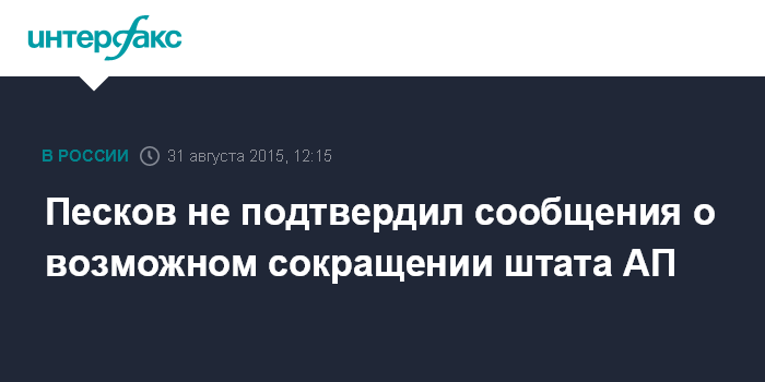 Москва. 31 августа. INTERFAX.RU - Пресс-секретарь президента России Дмитрий Песков пока не располагает информацией о возможном сокращении штата администрации президента и зарплат сотрудников этой структуры.