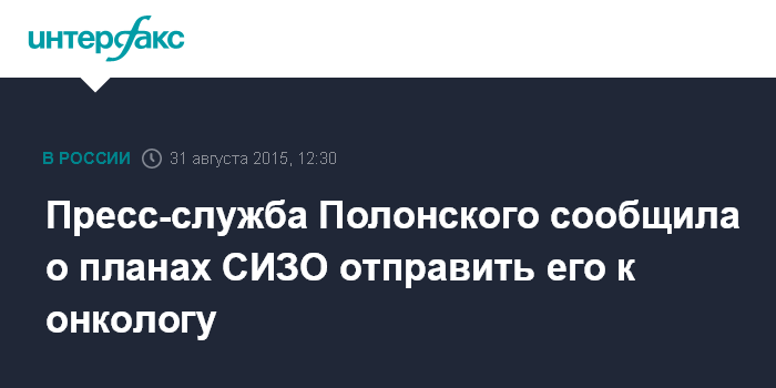 Москва. 31 августа. INTERFAX.RU - Администрация следственного изолятора, где содержится арестованный бизнесмен Сергей Полонский, намерена обратиться за консультацией к врачу-онкологу для уточнения диагноза и методов его лечения, сообщила пресс-служба предпринимателя.