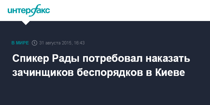 Москва. 31 августа. INTERFAX.RU - Председатель Верховной рады Владимир Гройсман призывает правоохранительные органы немедленно найти виновных в столкновениях возле здания парламента в Киеве.