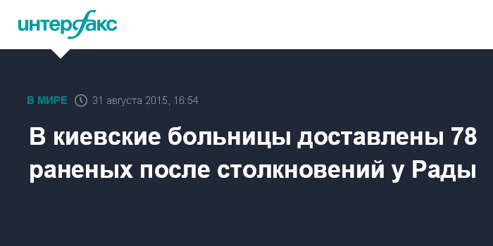 Москва. 31 августа. INTERFAX.RU - В больницах Киева сейчас находятся 78 раненых, пострадавших в результате столкновений у здания Верховной рады Украины, сообщила народный депутат, советник президента страны по гуманитарным вопросам Ольга Богомолец.