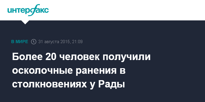 Москва. 31 августа. INTERFAX.RU - К бригадам скорой после столкновений возле Верховной рады за медпомощью обратились 44 человека, у 21 из них - осколочное ранение, информирует министерство здравоохранения Украины.
