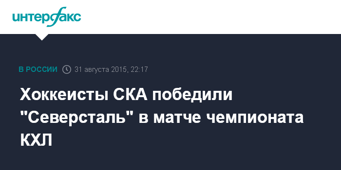 Москва. 31 августа. INTERFAX.RU - В матче очередного тура регулярного чемпионата Континентальной хоккейной лиги (КХЛ) обладатель Кубка Гагарина петербургский СКА в Череповце одолел местную команду "Северсталь".