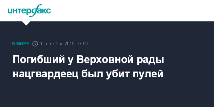 Москва. 1 сентября. INTERFAX.RU - Погибший в понедельник военнослужащий Национальной гвардии Украины Игорь Дебрин, получивший смертельное ранение в ходе столкновений возле парламента, был убит пулей, а не осколком гранаты, заявляют в МВД.