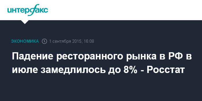 Москва. 1 сентября. INTERFAX.RU – Оборот ресторанов, кафе и баров в России в июле 2015 года по сравнению с июлем прошлого года сократился на 8% и составил 106,2 млрд рублей, сообщил Росстат во вторник. По сравнению с июнем, когда рынок снизился на 8,2%, падение замедлилось. Июнь стал худшим месяцем по динамике с начала года.