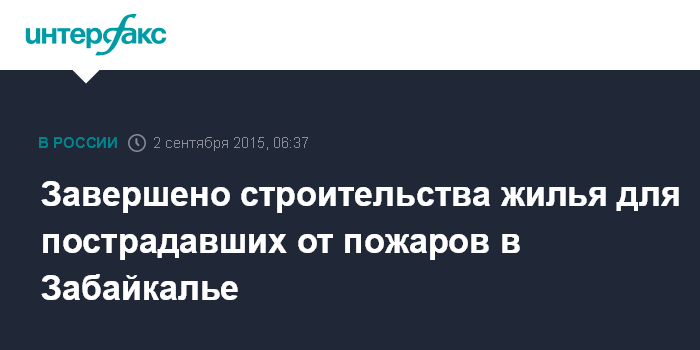 Москва. 2 сентября. INTERFAX.RU - Строительные работы, проводимые для ликвидации последствий природных пожаров, произошедших весной текущего года, завершены в Забайкальском крае, сообщает Сибирский окружной информационный центр.