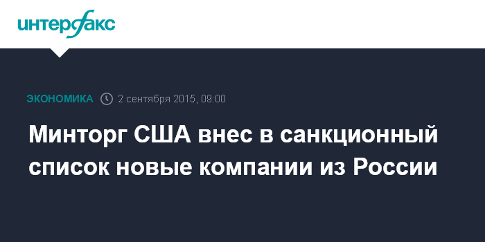Москва. 2 сентября. INTERFAX.RU - Бюро промышленности и безопасности министерства торговли Соединенных Штатов Америки вносит в санкционный список новые компании из России, говорится в сообщении, опубликованном на сайте правительственного издания Federal Register.