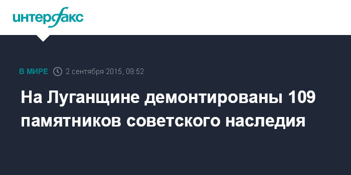 Москва. 2 сентября. INTERFAX.RU - В Луганской области Украины завершается демонтаж памятников по закону о декоммунизации - из 151 памятника, подпадающих под его действие, фактически демонтировано 109, сообщает пресс-служба областной военно-гражданской администрации.