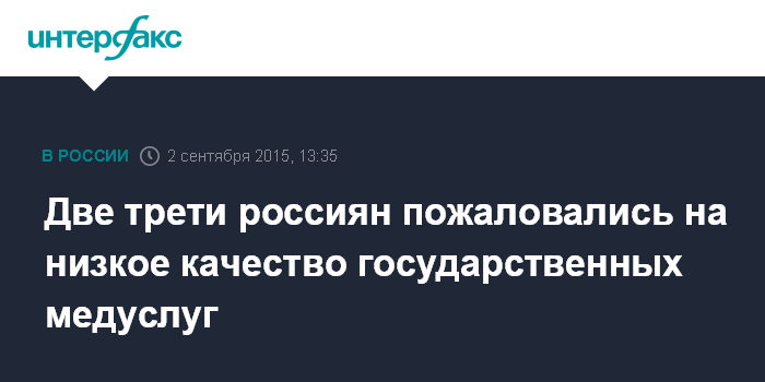 Москва. 2 сентября. INTERFAX.RU - Две трети граждан России (65%) оценивают качество медицинских услуг, предоставляемых в государственных больницах и поликлиниках, как низкое, сообщает ВЦИОМ.