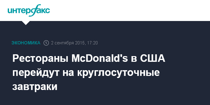 Москва. 2 сентября. INTERFAX.RU – Крупнейшая сеть ресторанов быстрого питания в мире McDonald's пытается поддержать интерес к бренду на фоне ослабления спроса на фастфуд. С 6 октября блюда, ранее подававшиеся только на завтрак, будут доступны круглосуточно более чем в 14,3 тыс. заведений компании в США.