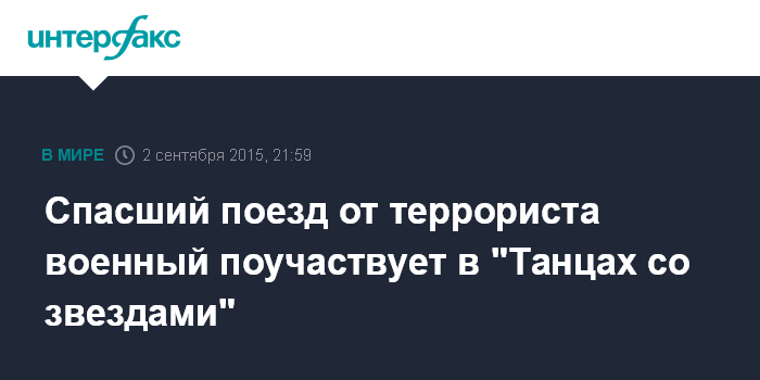 Москва. 2 сентября. INTERFAX.RU - Военнослужащий США Алек Скарлатос, наряду с другими тремя пассажирами обезвредивший мужчину в поезде Амстердам-Париж, приглашен на американскую телепередачу Dancing With The Stars, говорится твиттере программы.