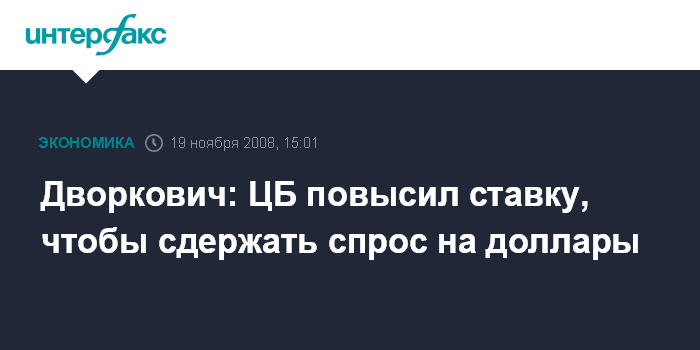 Москва. 19 ноября. INTERFAX.RU - Повышение Центробанком ставки рефинансирования (и других ключевых процентных ставок) на прошлой неделе было связано с необходимостью сдерживания спроса на доллары, заявил помощник президента России Аркадий Дворкович.