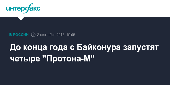 Москва. 3 сентября. INTERFAX.RU - Четыре пуска ракеты-носителя "Протон-М" намечается выполнить с космодрома Байконур до конца года, сообщили "Интерфаксу" в российской космической отрасли.
