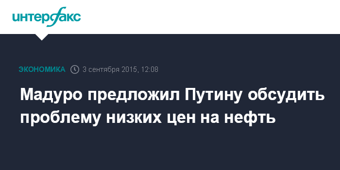 Москва. 3 сентября. INTERFAX.RU – Президент Венесуэлы Николас Мадуро заявил на встрече с российским лидером Владимиром Путиным о намерении обсудить с ним свои идеи по стабилизации ситуации на нефтяном рынке.