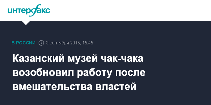 Москва. 3 сентября. INTERFAX.RU - Музей чак-чака в Казани, приостановивший накануне свою работу из-за разногласий с арендодателем, вновь открылся после вмешательства местных властей .