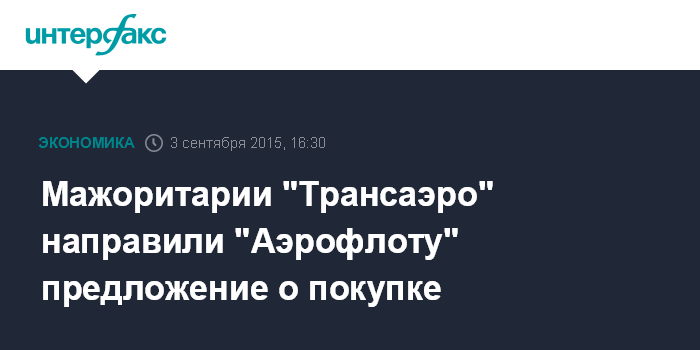 Москва. 3 сентября. INTERFAX.RU – Мажоритарные акционеры "Трансаэро" направили в "Аэрофлот" предложение о продаже ему 75% плюс 1 акция, говорится в сообщении "Трансаэро".