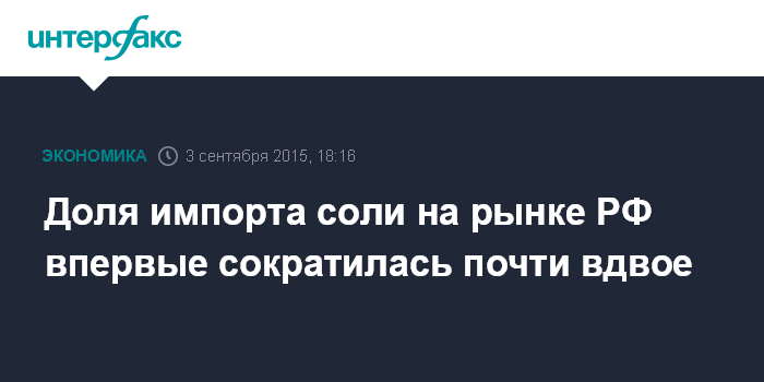 По его данным, за восемь месяцев 2015 года доля импортной соли снизилась до 33% (около 238 тыс. тонн) при общем объеме ее продажи в 709 тыс. тонн. За аналогичный период 2014 года доля импорта составляла 58% (более 413 тыс. тонн) при общем объеме рынка в 713 тыс. тонн.