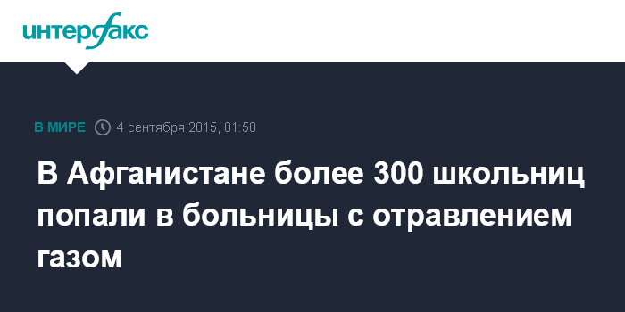 Москва. 4 сентября. INTERFAX.RU - В Афганистане за одну неделю в местные больницы попали более 300 школьниц с отравлением неизвестным газом, сообщает портал WCVB. Полиция подозревает, что инциденты стали результатом злого умысла неизвестных.