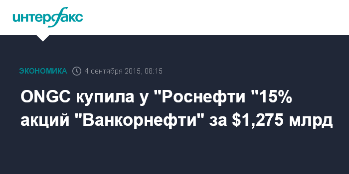 Москва. 4 сентября. INTERFAX.RU – Индийская ONGC приобрела у "Роснефти" 15% в "Ванкорнефти" почти за $1,3 млрд. "Сумма сделки составила $1,275 млрд", - сообщил "Интерфаксу" источник, знакомый с условиями сделки.