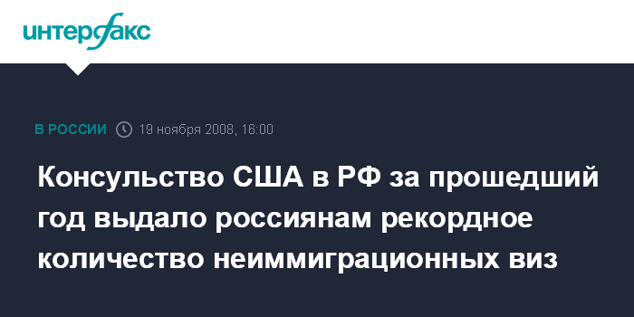 Москва. 19 ноября. INTERFAX.RU - С 1 октября 2007 г. по 1 октября 2008 года 200 тыс. россиян обратилось в консульство США за неиммиграционными визами, сообщил в среду в Москве заместитель руководителя дипломатической миссии США в РФ Эрик Рубин на встрече с российскими туроператорами.