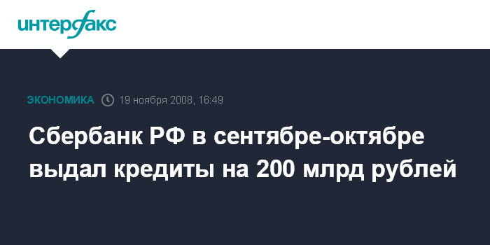 За сентябрь-октябрь 2008 года Сбербанк РФ увеличил портфель кредитов, выданных корпоративным клиентам, более чем на 150 млрд рублей, портфель кредитов населению за сентябрь-октябрь 2008 года вырос на 50 млрд рублей.