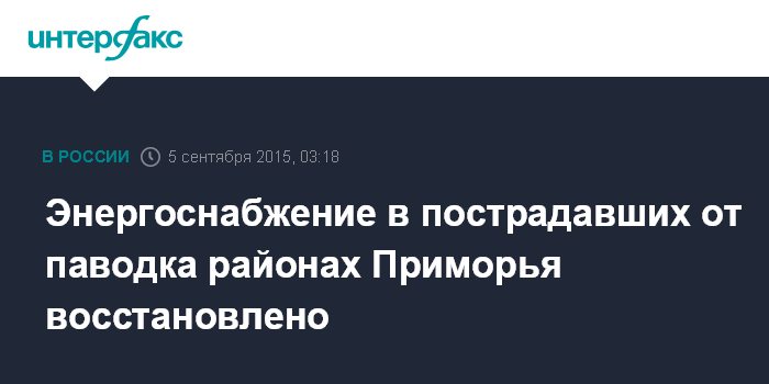 Москва. 5 сентября. INTERFAX.RU - Энергетики филиала АО ДРСК "Приморские электрические сети" выполнили основной объем работ по восстановлению электроснабжения в зоне затопления в Приморском крае, сообщила в субботу пресс-служба компании.
