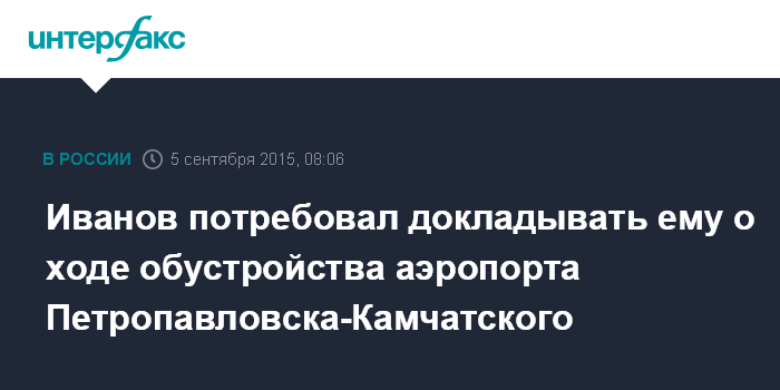 Москва. 5 сентября. INTERFAX.RU - Глава администрации президента РФ Сергей Иванов потребовал ежемесячно докладывать ему о ходе обустройства аэропорта Петропавловска-Камчатского, реконструкцию которого планируют завершить к маю 2016 года.