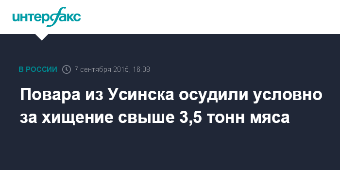 Москва. 7 сентября. INTERFAX.RU - Суд в Усинске (Коми) признал виновной повара строительной организации Викторию Филимонову, обвинявшейся в хищении почти четырех тонн мяса стоимостью 1,3 млн рублей, сообщает пресс-служба региональной прокуратуры.