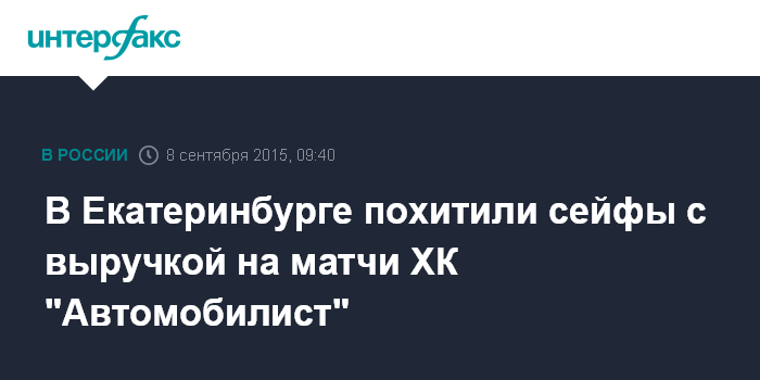 Москва. 8 сентября. INTERFAX.RU - В Екатеринбурге из культурно-развлекательного комплекса "Уралец" неизвестные похитили два сейфа с чуть более 1 млн рублей выручки от продажи билетов на матчи хоккейного клуба "Автомобилист".