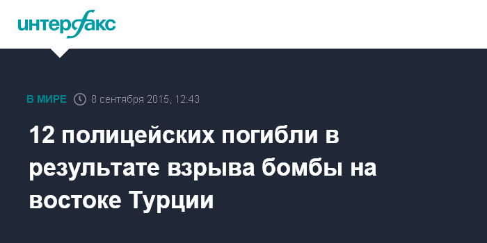 Москва. 8 сентября. INTERFAX.RU - В результате взрыва бомбы, заложенной на обочине дороги, на востоке Турции во вторник погибли 12 полицейских, сообщают турецкие СМИ.