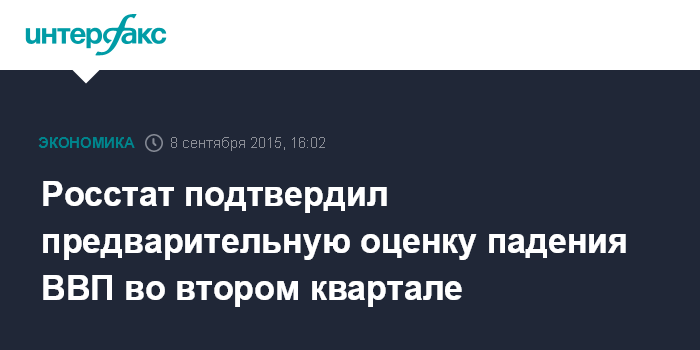 Росстат подтвердил предварительную оценку падения физического объема ВВП на 4,6% по сравнению со вторым кварталом 2014 года (предварительная оценка была опубликована в середине августа и оказалась хуже расчетов Минэкономразвития, которое оценивало снижение ВВП во втором квартале на 4,4%). В первом квартале 2015 года спад экономики России составил 2,2%.