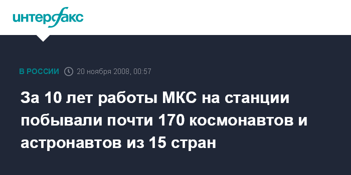 С 2000 года, когда на станцию прибыл первый экипаж, ее посетили 168 человек: 116 американцев, 27 россиян, пять граждан Канады, четыре представителя Японии, по три итальянских и французских астронавта, два немца, а также по одному гражданину из ЮАР, Бельгии, Испании, Нидерландов, Бразилии, Швеции, Малайзии и Южной Кореи, сообщил "Интерфаксу-АВН" руководитель пресс-службы Центра управления полетами Валерий Лындин.