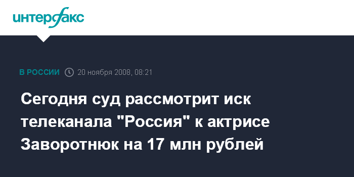 Москва. 20 ноября. INTERFAX.RU - Симоновский суд Москвы приступит в четверг к рассмотрению по существу иска телеканала "Россия" к актрисе и телеведущей Анастасии Завортнюк, в связи с нарушением ею условий договора.