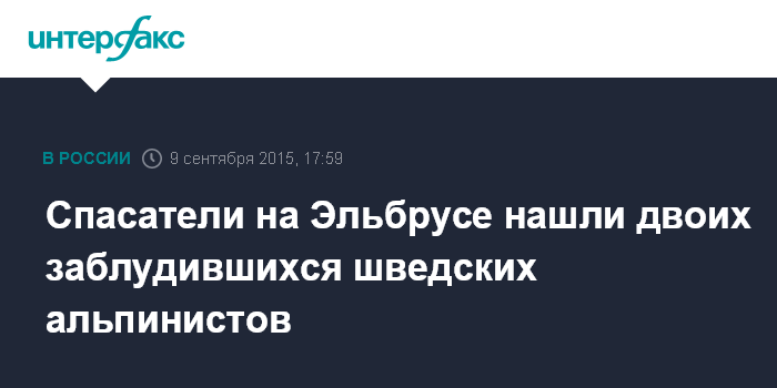 Москва. 9 сентября. INTERFAX.RU - Шведские альпинисты, заблудившиеся на Эльбрусе, найдены живыми, сообщил агентству "Интерфакс" руководитель пресс-службы ГУ МЧС России по КБР Кантемир Беров в среду.