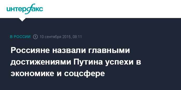 Москва. 10 сентября. INTERFAX.RU - Главным достижением президента РФ Владимира Путина за годы нахождения у власти россияне считают экономическое развитие страны (13%) и повышение уровня жизни граждан, а также рост зарплат и пенсий (12%), сообщили "Интерфаксу" в "Левада-Центре".