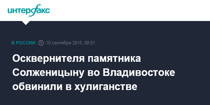 Москва. 10 сентября. INTERFAX.RU - Сталиниста из Владивостока, который 7 сентября повесил табличку с надписью "Иуда" на шею бронзового памятника Александру Солженицыну, обвинили в нарушении административного кодекса.
