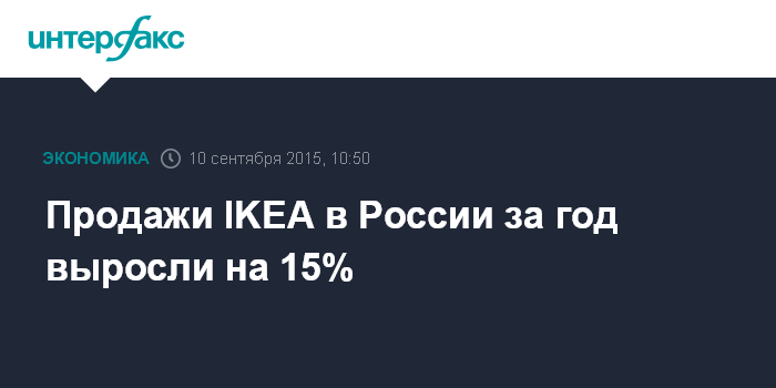 Москва. 10 сентября. INTERFAX.RU – Шведская IKEA в 2015 финансовом году, который завершился 31 августа, увеличила продажи в России на 14,7% по сравнению с прошлым годом. Магазины "ИКЕА" посетили 74 млн человек.