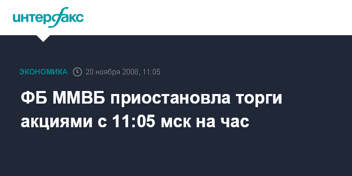 Москва. 20 ноября. INTERFAX.RU - Фондовая биржа ММВБ приостановила в четверг торги всеми акциями с 11:05 мск на час из-за падения технического индекса биржи более чем на 5% к уровню закрытия предыдущего дня. Как отмечается в сообщении биржи, к 11:00 мск технический индекс ММВБ упал на 6,81% - до 669,51 пункта.