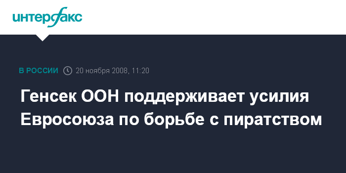 Генсек ООН выразил серьезную обеспокоенность по поводу участившихся в последние несколько дней актов пиратства у побережья Сомали. Он решительно осудил разгул морских разбойников и поддержал усилия стран-членов ООН, направленные на разрешение этой проблемы, передает в четверг служба новостей ООН.