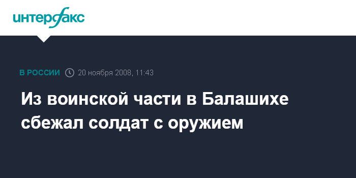 Москва. 20 ноября. INTERFAX.RU - В Подмосковье сотрудники милиции разыскивают вооруженного солдата, покинувшего свою воинскую часть. Как сообщил "Интерфаксу" источник в правоохранительных органах, в четверг воинскую часть, дислоцированную в Балашихе, покинул рядовой Иннокентий Петелькин. При себе он имел автомат Калашникова и два магазина.